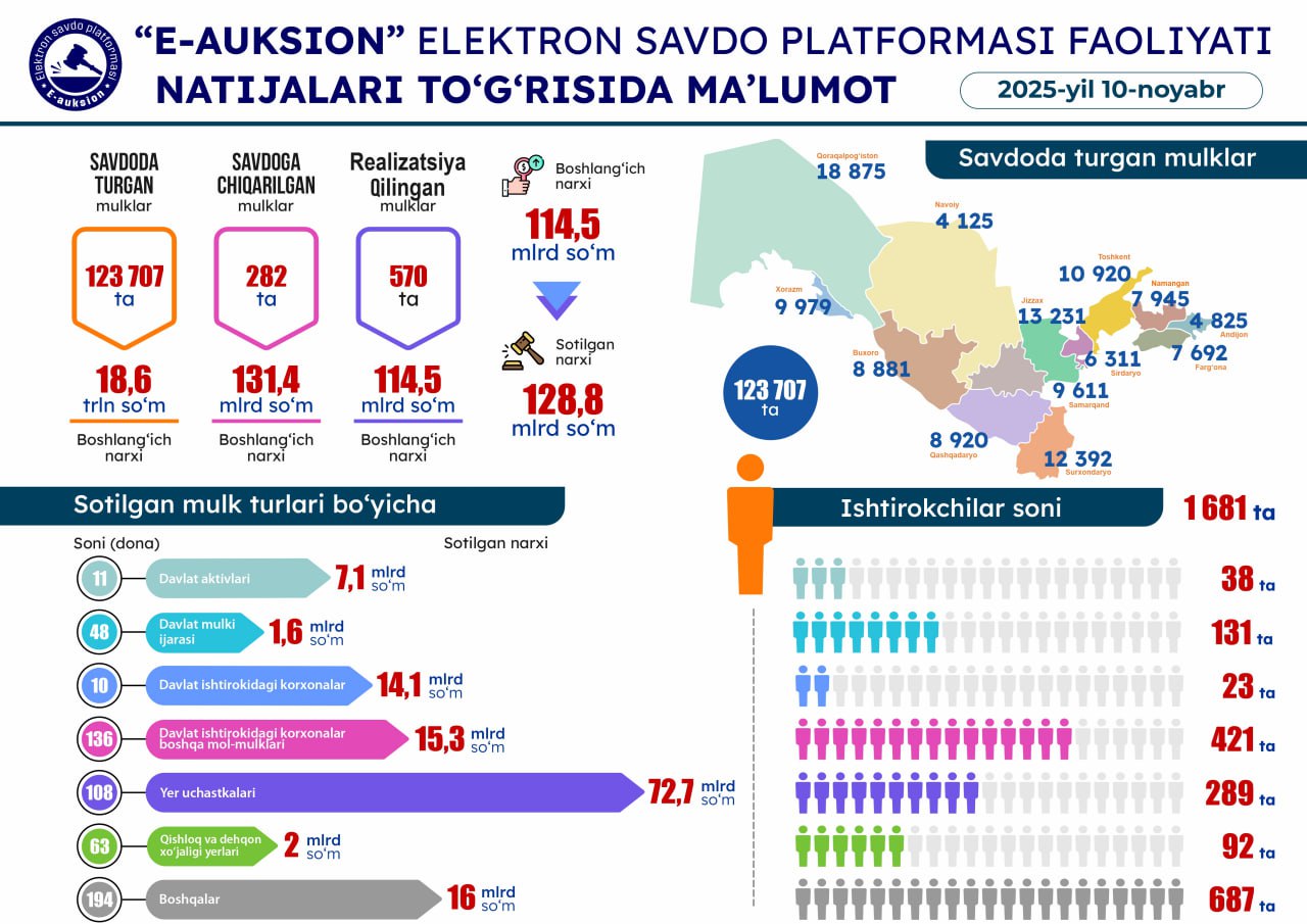 282 lots were put up for online auctions. Also, 570 lots with a starting price of 114.5 billion soums were sold for 128.8 billion soums.