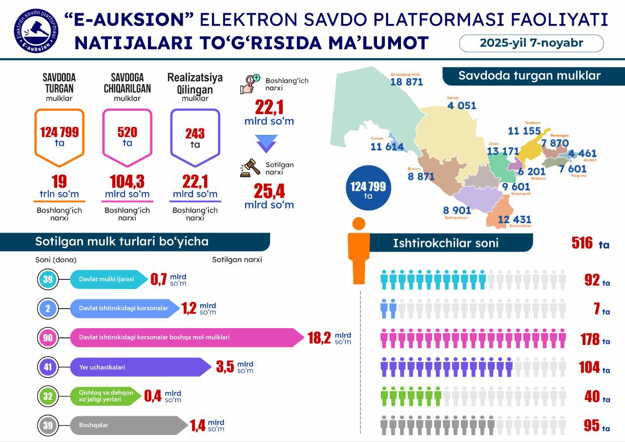 520 lots were put up for online auctions. Also, 243 lots with a starting price of 22.1 billion soums were sold for 25.4 billion soums.